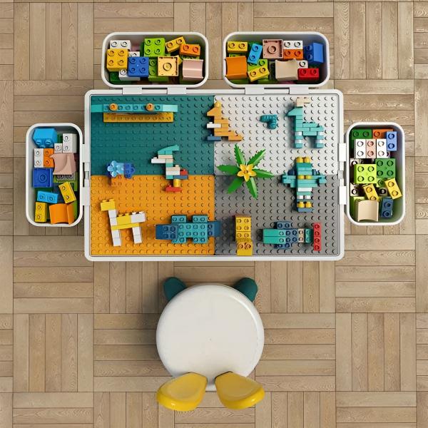 Το τραπέζι μπορεί να χρησιμοποιηθεί και από τις δύο πλευρές, με τη μία πλευρά να είναι σχεδιασμένη για συναρμολόγηση με τουβλάκια και την άλλη να διαθέτει επίπεδη επιφάνεια.